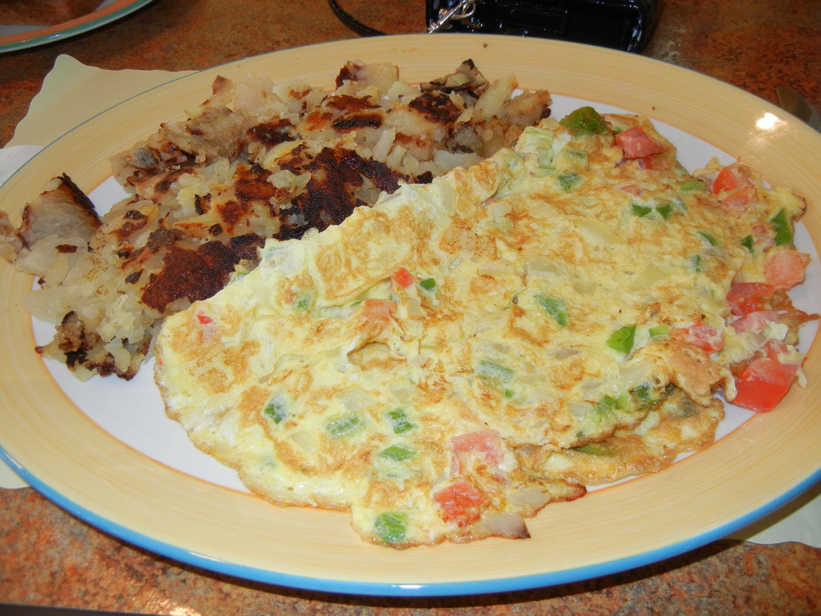 My veggie omelet the size of my head....it was very thin and that's how I justified eating almost the entire thing. This omelet had tomatoes, onions, green pepper, and mushrooms. It was very good.